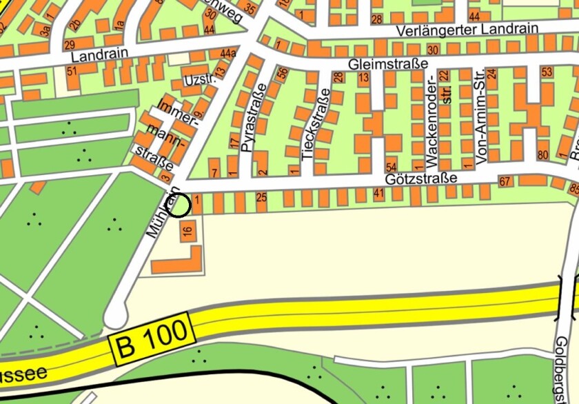 Über die B100 besteht eine direkte Anbindung an die Autobahnen A14 und A9 sowie an den Hauptbahnhof. Damit ist das Grundstück sowohl für Pendler als auch für Personen mit lokalem Arbeitsplatz attraktiv. Der Mühlrain fungiert zudem als wichtige Verbindungsstraße innerhalb des Viertels.