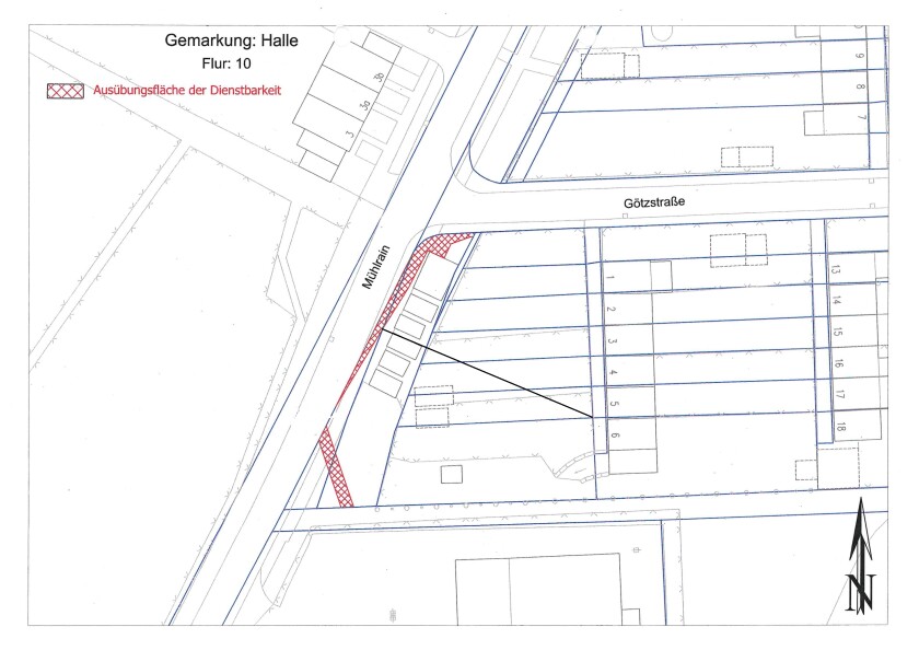 Über die Flurstücke 1494 und 1496 verlaufen Mischwasserdoppeldruckleitungen DN 400 und DN 600. Zur Sicherung dieser Leitungen wird im Rahmen des Kaufvertragsabschlusses eine Dienstbarkeit zugunsten der Hallesche Wasser und Stadtwirtschaft GmbH bestellt und im Grundbuch eingetragen. Auf diesem Schutzstreifen dürfen für die Dauer des Bestehens keine Gebäude errichtet werden oder sonstige Einwirkungen vorgenommen werden, die den Bestand oder den Betrieb der Anlage beeinträchtigen oder gefährden (siehe „Ausübungsbereich Dienstbarkeit SWH“).